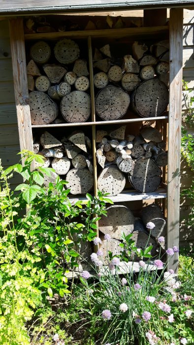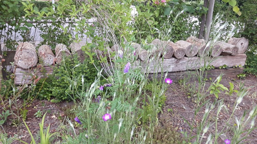 In de zijtuin heb ik in de stammetjes van een gevelde boom gaten gemaakt en ze neergelegd op een zonnige plek. Ze liggen daar nu al maanden en er gebeurt daar helemaal niets. Niet één gaatje is gevuld en er vliegt ook niets omheen. Misschien moet ik daar ook een dakje boven maken. Ik heb een paar stammetjes in het bijenhotel gelegd om te testen of de bijen daar wel in de gaatjes gaan nestelen. Als dit lukt, moet ik maar een soort dakje gaan maken hierboven.