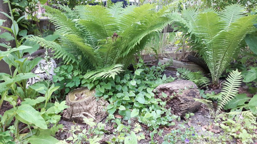 In de ‘Stumpery’ liggen een brokken hout bij elkaar, die een mooie verstopplek vormen voor allerlei insecten. Hoewel het een schaduwplek is, vliegt hier ook vanalles rond. Wie weet wat hier aan het nestelen is? Misschien vinden de hommels hier wel een plekje?