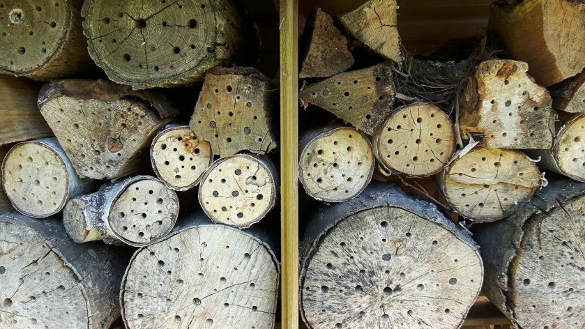 In de zijtuin heb ik in de stammetjes van een gevelde boom gaten gemaakt en ze neergelegd op een zonnige plek. Ze liggen daar nu al maanden en er gebeurt daar helemaal niets. Niet één gaatje is gevuld en er vliegt ook niets omheen. Misschien moet ik daar ook een dakje boven maken. Ik heb een paar stammetjes in het bijenhotel gelegd om te testen of de bijen daar wel in de gaatjes gaan nestelen. Als dit lukt, moet ik maar een soort dakje gaan maken hierboven.