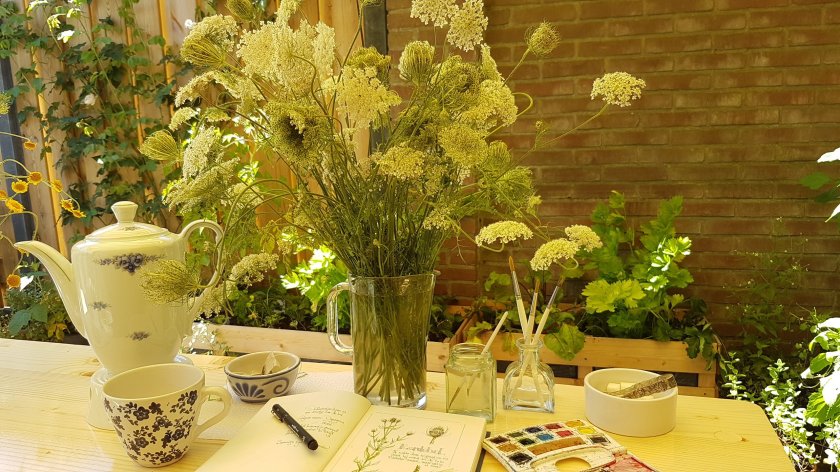 Er staat heel veel peen in de tuin: zwierige schermbloemen van 2 meter hoog. Aangezien deze vaak omvallen heb ik er inmiddels vazen vol van. Gezellig op tafel!