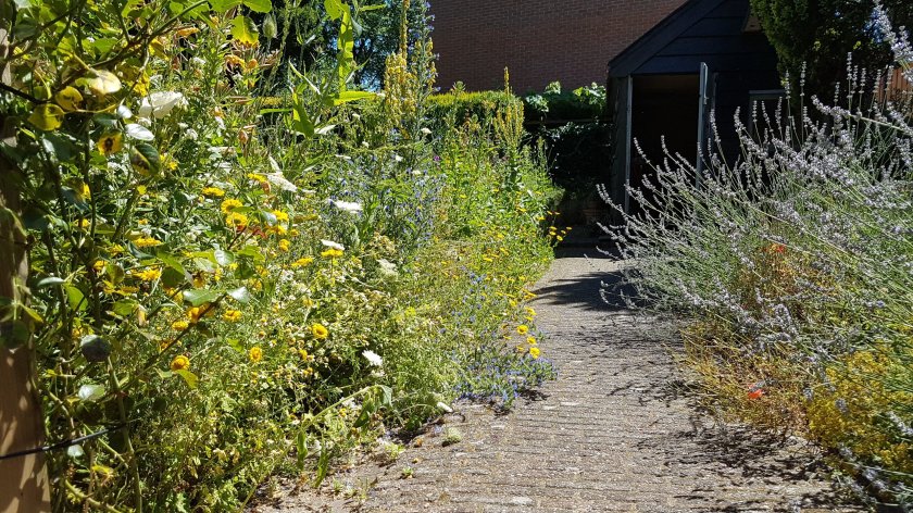 Mijn snoeibeleid (wat omvalt knip ik weg voor in een vaas) werkt niet helemaal. Op dit paadje groeien allemaal planten waar de hele dag insecten op vliegen. Ik kan het niet over mijn hart verkrijgen om het weg te halen, dus zigzag ik er maar een beetje tussendoor. Mijn vazen zitten toch al vol.