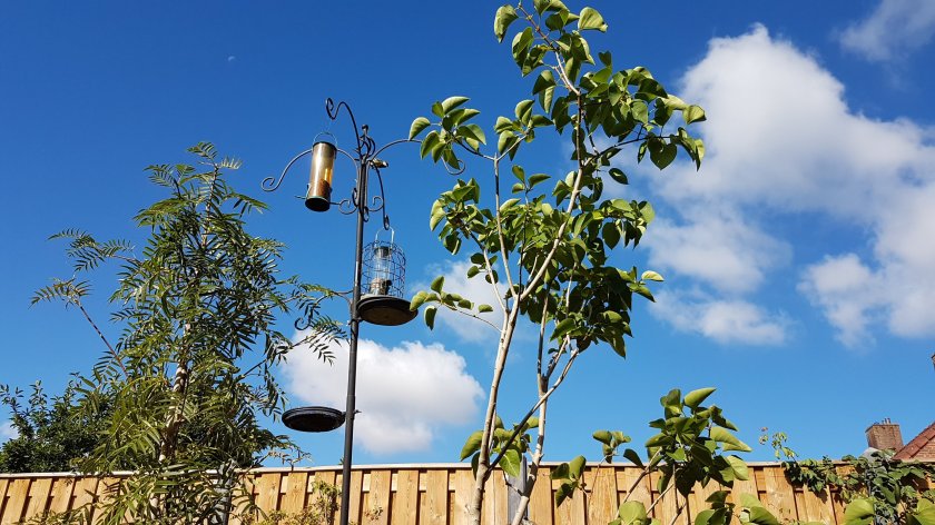 De tuin was helemaal leeg en stil toen ik hier kwam. Alles was kaal met veel tegels en alleen gras en er waren geen insecten, geen vogels, niets. Nu de tuin weelderiger wordt, komen er steeds meer beestjes. Het is voor de vogels nog wel wennen, maar sinds de voerpaal omgeven wordt door 2 boompjes, durven ze beter.