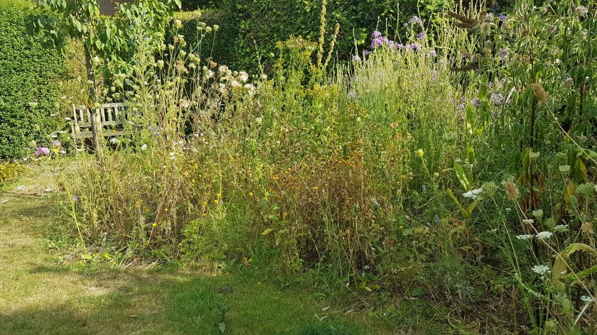 Vorig jaar viel het nog mee met de droogte in de bloemenwei, maar nu zie je het heel goed: het begint allemaal stro te worden. Er staat nog genoeg, maar de bloei is er wel af. Ik laat de uitgebloeide bloemen nog even staan, want die geven ook weer schaduw op de bodem. Gelukkig zijn de structuren ook mooi om te zien: de kaardebollen, de stalkaarsen en de distels. De koninginnekruid gaat nu beginnen met bloeien, dus ik hoop dat die nog even de show gaan stelen. En misschien nog een enkele cichorei of kaasjeskruid?