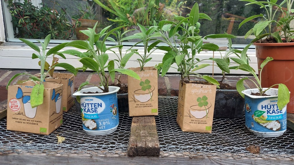 Als je plantjes stekt om weg te geven, kan je voorraad aan plantenpotjes snel slinken. Dan is het handig om de stekken in alternatieve potjes te planten. Met je wekelijkse boodschappen haal je veel handige tuinspullen in huis: zoals plastic fruitbakjes die direct klaar voor gebruik zijn als plantenpot omdat er al gaatjes in zitten. Lege melkpakken kun je halveren en gaatjes onderin maken. Ook andere zuivelbakjes kun je hiervoor gebruiken. Zo’n rijtje alternatieve plantenpotjes ziet er lekker fleurig uit.
