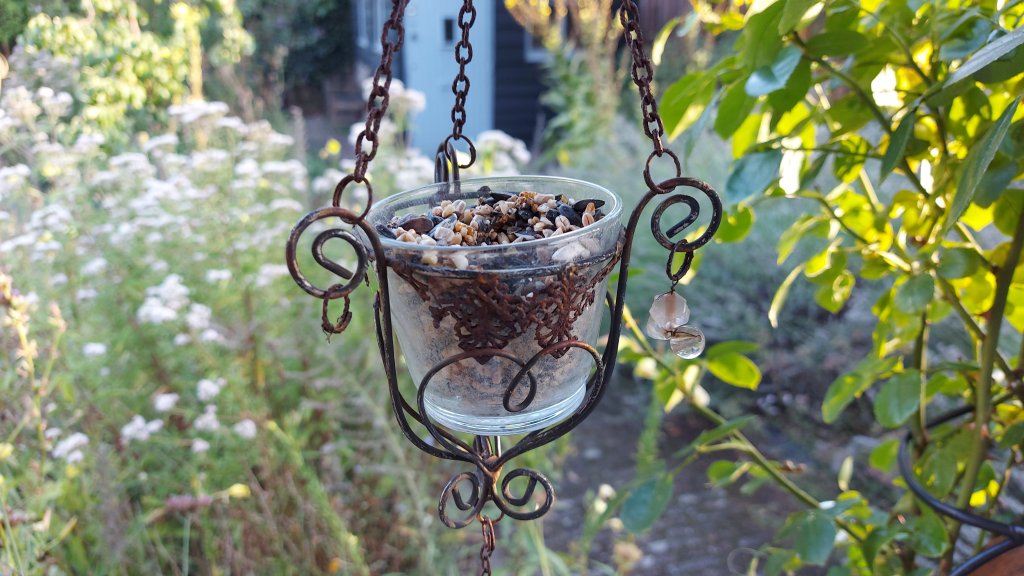 Een oude hanger met een glaasje voor waxinelichtjes was stuk gegaan en dient nu als mooi vogelvoerbakje. Hij hangt wel overdekt, want anders zou het voer nat worden en gaan schimmelen. Nu kunnen de vogeltjes stylish verantwoord eten.
