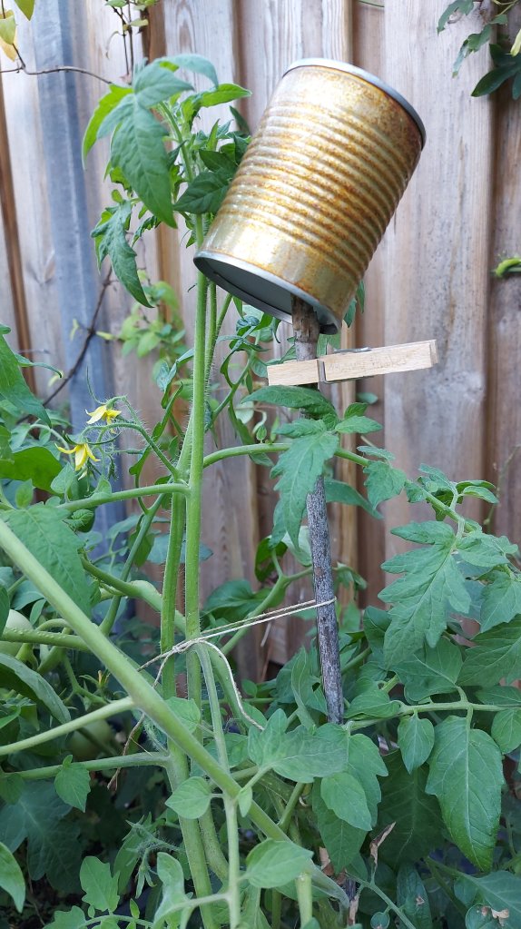 Als planten hard groeien heb je stokken nodig om ze te steunen, zoals bij deze tomaat. Dat kun je met bamboestokken doen, maar je kunt natuurlijk ook wat snoeihout bewaren en dat gebruiken. Je kunt je lelijk bezeren aan zulke stokken (je ogen!) dus daar doen luxe tuiniers speciale aardewerk potjes overheen. Ik doe dat met oude blikjes.