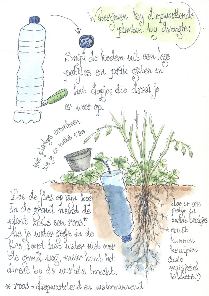 De afgelopen jaren is het extreem droog in het oosten van Nederland en dus ook in mijn tuin. Om de planten een beetje te helpen voeg ik bij het planten niet alleen potgrond en compost toe, maar stop ik ook een omgekeerde pet-fles in de grond. Het is hier vaak zo droog dat water niet in de grond zakt, maar direct wegloopt. Door het water bij het sproeien direct in de fles te gieten, kun je zorgen dat het direct bij de wortels terechtkomt. Als je wat gaatjes in de dop prikt en die erop laat, maak je er een soort druppelaar van die er langer over doet om het water in de grond te laten lopen. Zet wel een klein potje in de fles, zo kunnen kleine diertjes (muisjes, kikkertjes) die erin vallen er ook weer uit kruipen.
