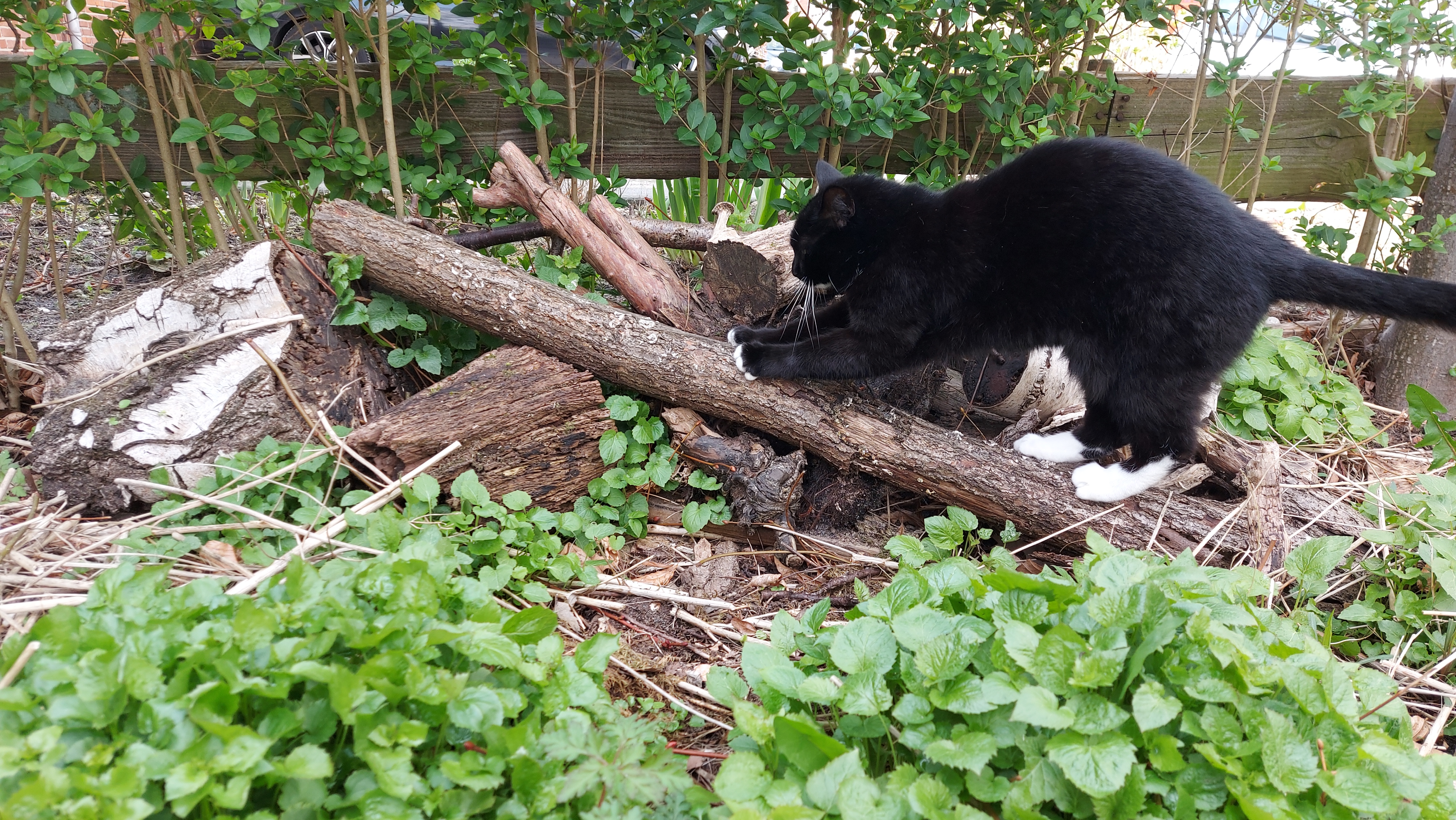 Doordat er altijd iets te vinden is, zijn er constant vogels in mijn tuin. De hele dag vliegen ze af en aan en ook zij zijn voor me aan het werk: zodra er rupsjes, luizen of ander gespuis te zien is komen zij het probleem voor me oplossen. Omdat ik ze een beetje extra wil verwennen heb ik ook wat vogelzaad hangen. Wat ze knoeien belandt eronder op de grond en in de potten. Altijd een verrassing wat er opkomt en zo heb je gratis bloemen. Zo is er wel eens een enorme zonnebloem ineens verschenen!