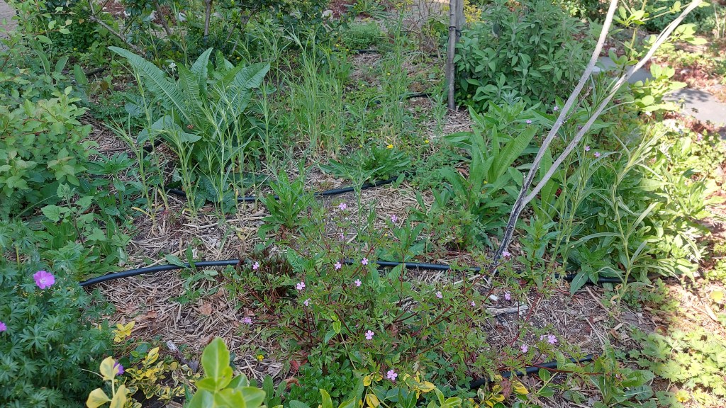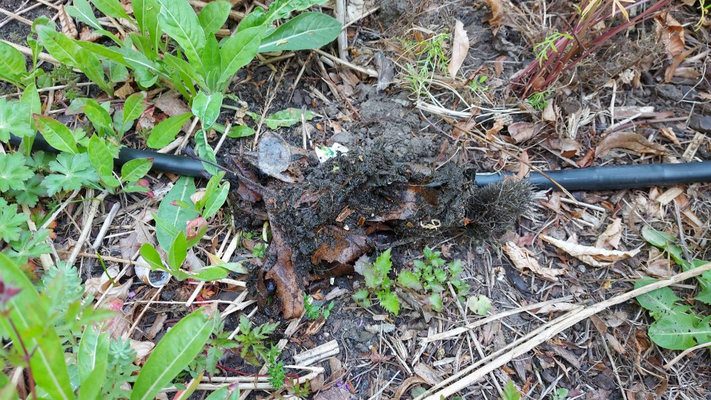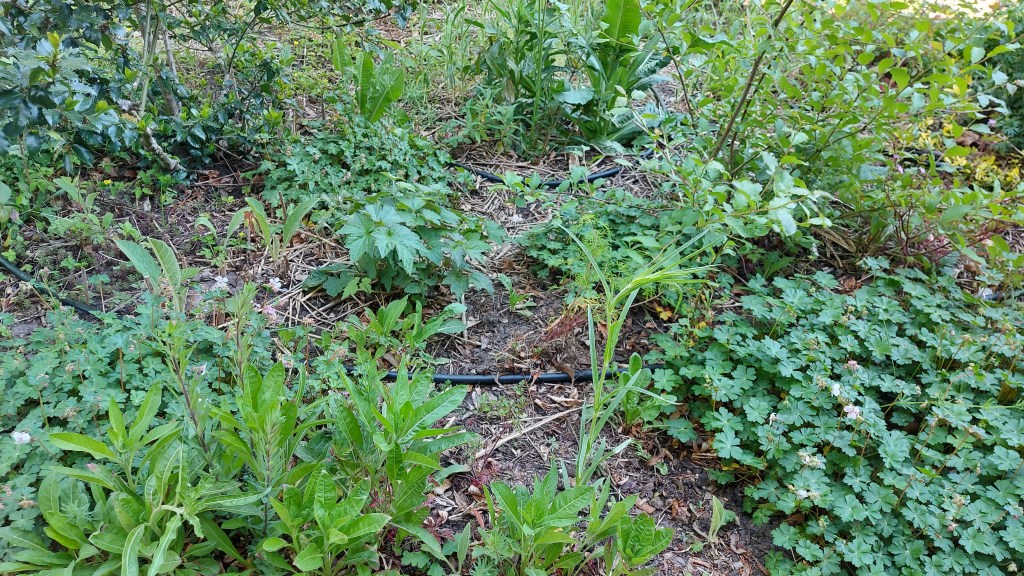 Tsja, dat is wel heel lelijk, zo’n zwarte slang slingerend door de tuin. In de loop der tijd zal het wel overgroeid worden met planten, maar in de tussentijd probeer ik het te bedekken met alle frutsels die nog op de bodem liggen. Het eerste klusje dat op de planning staat: compost verspreiden over de slang. Dan zal er nòg minder water verdampen en zie je die lelijke slang ook niet meer. En wie weet wat er uit de compost weer allemaal voor moois op zal komen?