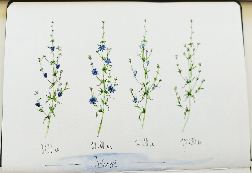 Het begint ’s morgens, dan staan de bloemetjes in diepblauwe kleur rechtop en zie je de bijen er al ongeduldig omheen vliegen, wachtend tot ze erbij kunnen. Gedurende de ochtend gaan de bloemen wijd open en lijken het knalblauwe sterren, die continu bezocht worden door bijen, hommels en zweefvliegen. Aan het einde van de middag worden de uiteinden steeds fletser en sluit de bloem zich langzaam. De laatste bijtjes proberen dan toch nog om tussen de dichte bloemblaadjes te kruipen. ’s Avonds zijn er alleen nog uitgedroogde bruine toefjes over en kun je bijna niet geloven dat hier een paar uur geleden nog van die stralende blauwe bloemen aan zaten. Gelukkig zit de Cichorei altijd vol knoppen, dus de volgende dag komt er weer een nieuwe lichting aan.