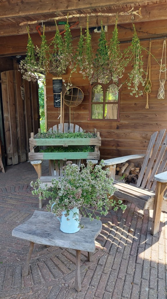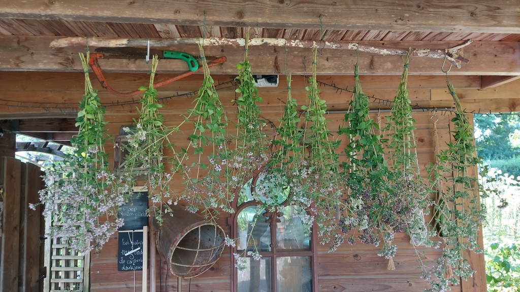De liggende takken heb ik in oude gaasbakken gelegd: een houten bak met gaas als bodem, die gebruikt werden om bloembollen te drogen en op te slaan. Perfect voor het drogen van kruiden dus. De takken lagen naast elkaar, waardoor er steeds aan alle kanten lucht omheen kon. De grote, wat oudere takken in een andere bak dan de jonge takken met verse blaadjes.