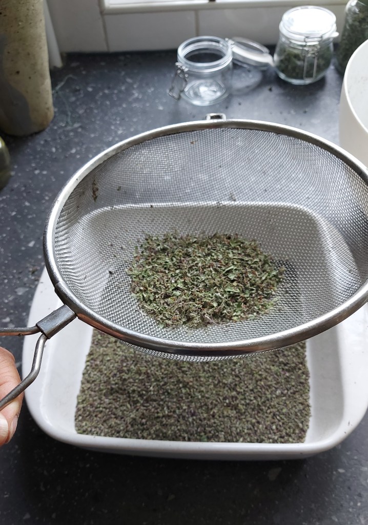 Volgens de Italiaanse meneer zijn de gedroogde bloemen nóg lekkerder dan de blaadjes, dus dat heb ik ook getest. Inderdaad hebben de bloemen ook weer een heerlijke kruidige smaak, maar weer anders dan het blad. Wrijf de bloemen tussen je handen fijn boven een diepe schaal. Als je alle bloemen eraf hebt, zeef het dan zodat alle grove en scherpe stukjes eruitgehaald worden. Wat overblijft is een heerlijke bloemen-oregano met prachtige kleuren. Ook deze kun je in de koelkast lang bewaren.