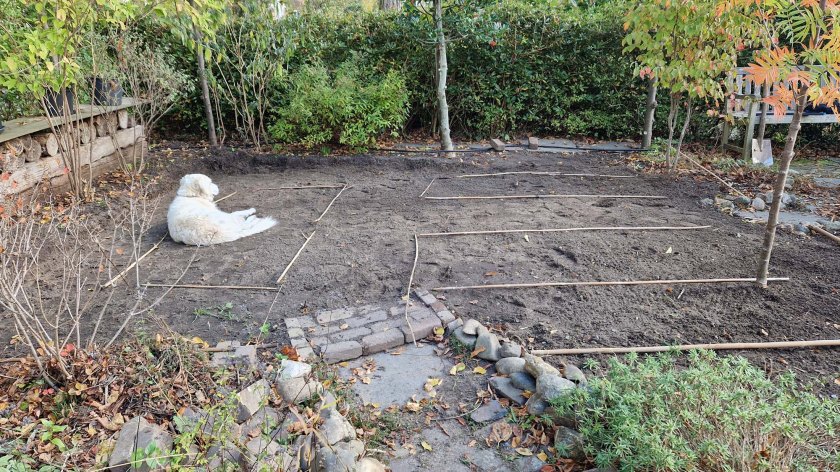 Voor de zekerheid toch nog even nagemeten of het wel klopt: met stokken heb ik alles uitgelegd op de plek zelf. Hebben de bakken voldoende tussenruimte? Moet er nog iets verplaatst worden om meer ruimte te krijgen? De lijsterbes en het stoepje bleken tegen een bak aan te komen en moesten toch verplaatst worden.