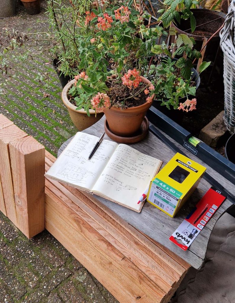 Voor de bakken heb ik stevig Douglashout besteld en palen voor de constructie. Ook heb ik het hekje van kastanjehout meteen besteld, zodat alles in één keer bezorgd kon worden.