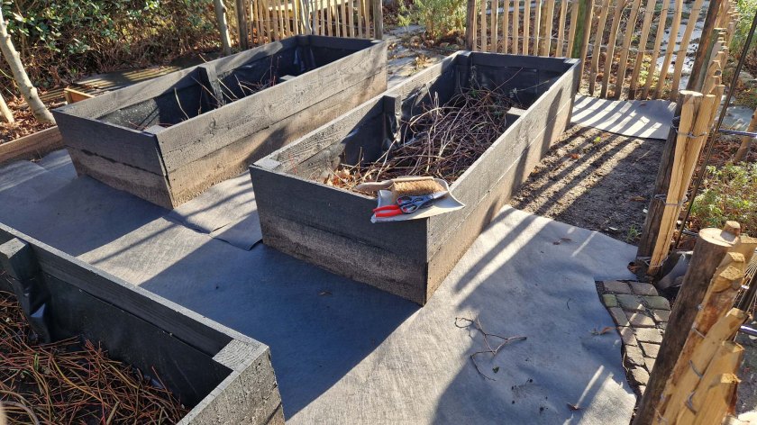 In de bakken ligt een bodem van gesnoeide takken. Die kunnen daar op hun gemak verteren.
