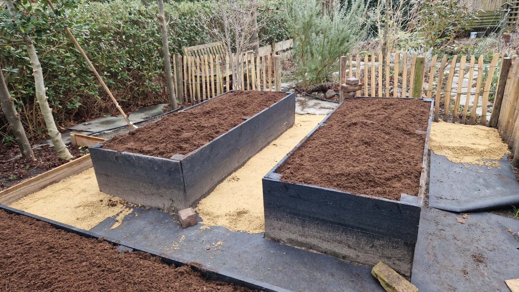 De paden zijn aangelegd en de moestuinbakken zijn gevuld. Laat de lente maar beginnen.