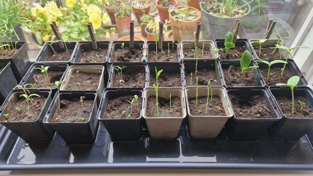 In ’mijn eigen’ bak heb ik ijsbergsla en knoflook geplant, daaromheen worteltjes gezaaid en nog een rijtje pluksla erbij gezet. De andere helft van de bak is gereserveerd voor de tomaten, courgette en komkommer die ik heb voorgezaaid en die binnen voor het raam staan te genieten van de zon. Daar staan ook de ‘sweet peas’ (Lathyrus) bij, die ik over het poortje wil laten groeien zodat ook die overladen zal worden met bloemetjes.