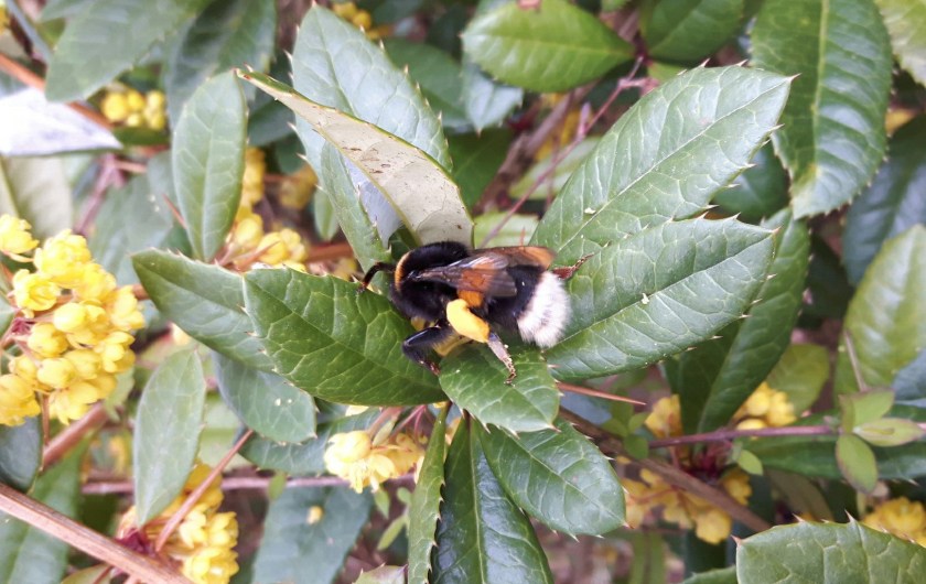 Alle uitlopende takken van de heg staan in bloei met hele kleine gele bloemetjes. De hommels en bijen zijn er gek op! Van ’s morgens vroeg tot ’s avonds laat hoor je het zware zoemen van alle bestuivende insecten die erin rondvliegen. En je kunt er lekker met je neus op zitten, dat vinden ze helemaal niet erg.