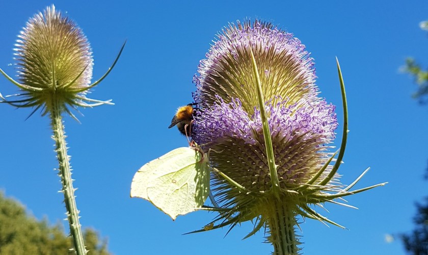 De tuin is een paradijs voor bestuivende insecten: er zijn volop vlinders, hommels en wilde bijen. Daardoor is het voor mij ook een paradijs: ik schuifel gewoon tussen al die zoemers door; ze storen zich niet aan mij. Zo heb ik van heel dichtbij wilde bijtjes kunnen filmen die in het bijenhotel hun eitjes aan het leggen waren.